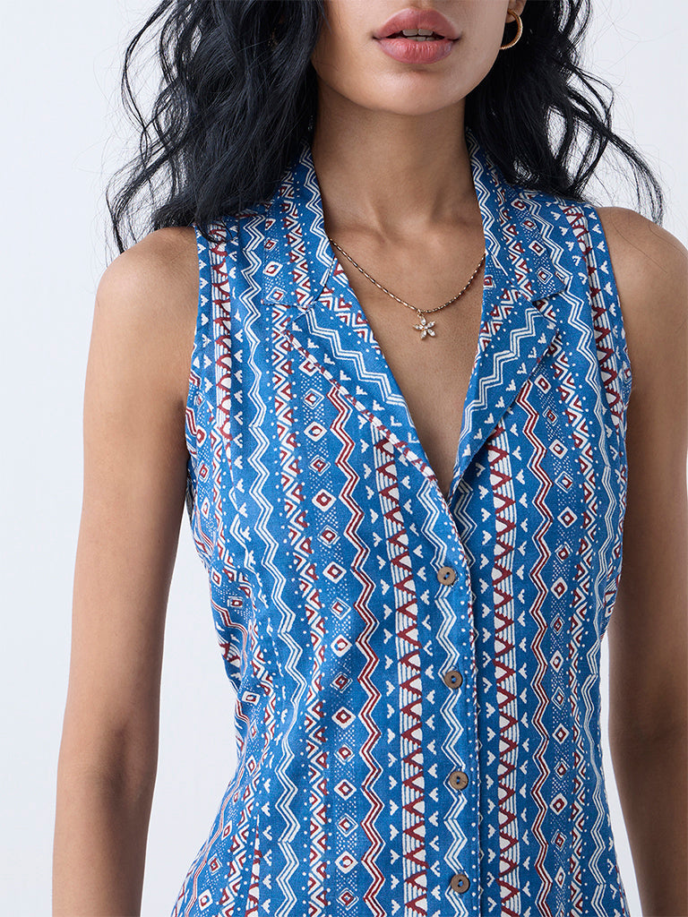 Breezy elegance defines this blue shirtdress from Bombay Paisley, animated with vibrant Aztec prints that channel a boho-ethnic charm. The A-line profile features a notch lapel collar, button-front detailing and a sleeveless cut, finished with an adjustable tie-back that sculpts the fit. Crafted from a cotton-blend fabric, it’s a comfortable choice for summer dressing and easy daytime plans.