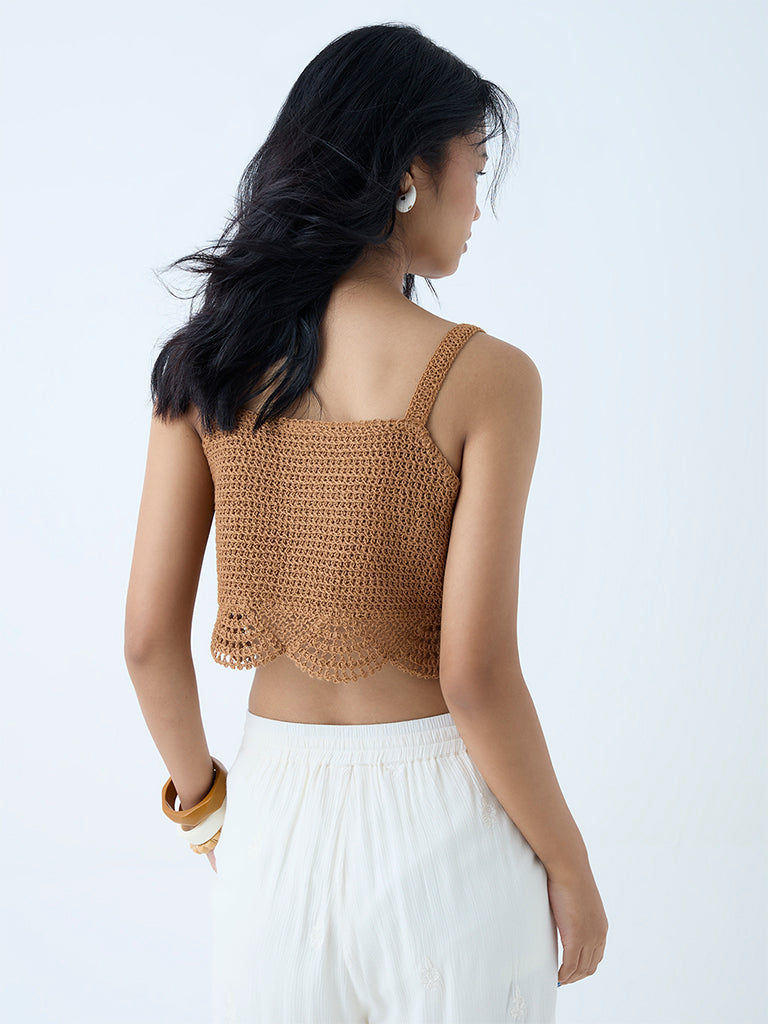 This brown top from Bombay Paisley is elevated with intricate crochet work that lends artisanal charm. Cut in a sleeveless frame with a clean V-neck, it strikes the right balance between casual ease and crafted detail.
