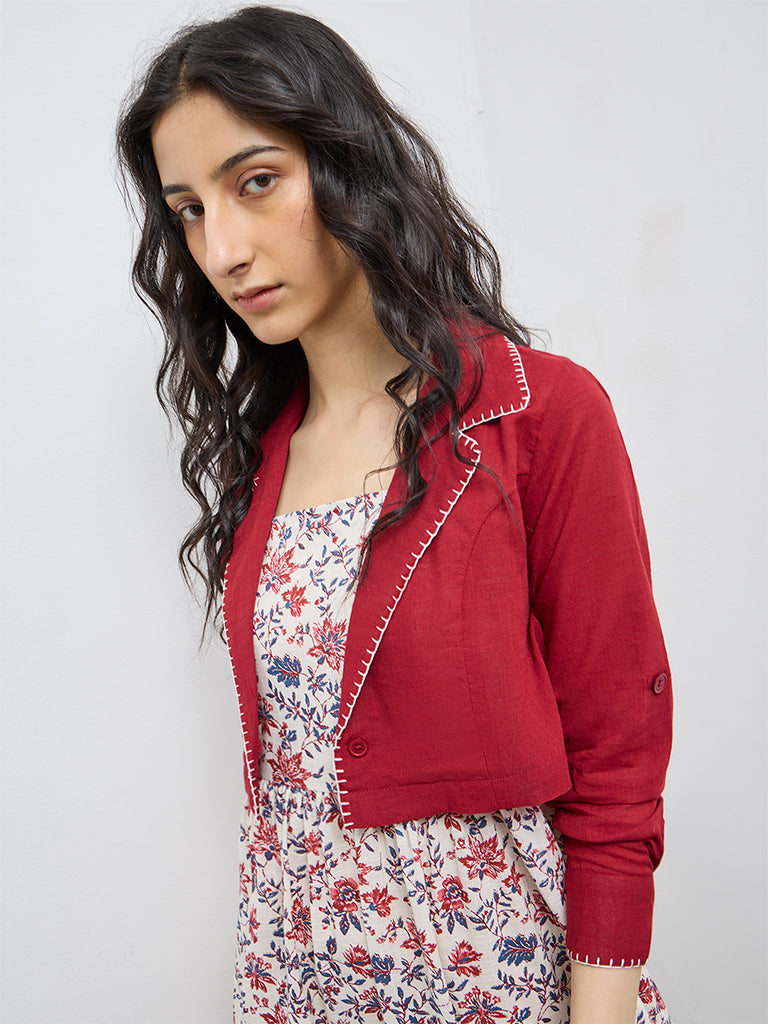 Bombay Paisley presents this off-white floral printed cotton summer dress designed with a square neckline and slender shoulder straps. A smocked back shapes the fit-and-flare silhouette, while tiered construction adds volume and fluid drape. Styled with a contrasting solid red jacket featuring a notched lapel collar and full sleeves, the look blends bohemian charm with contemporary, timeless appeal.