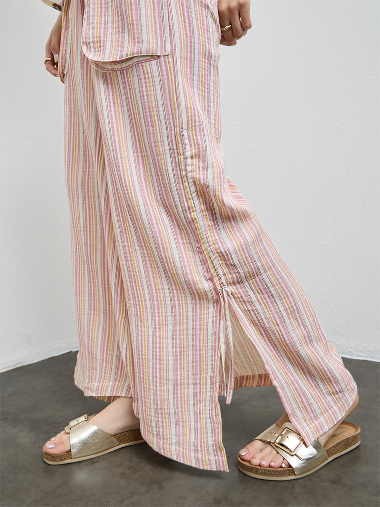 Easy stripes define these pink pants from Bombay Paisley. The elasticated waist with adjustable drawstrings ensures a flexible fit, while roomy side pockets add everyday practicality. Crafted from pure cotton, they are ideal for warm, unhurried days.