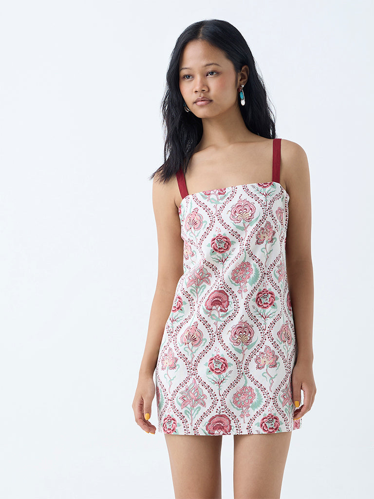 This red shift dress from Bombay Paisley is defined by its vibrant mix of botanical prints that add a touch of whimsy to its clean silhouette. Detailed with a square neck and adjustable shoulder straps, this one-piece will effortlessly amp up your indo-western look.