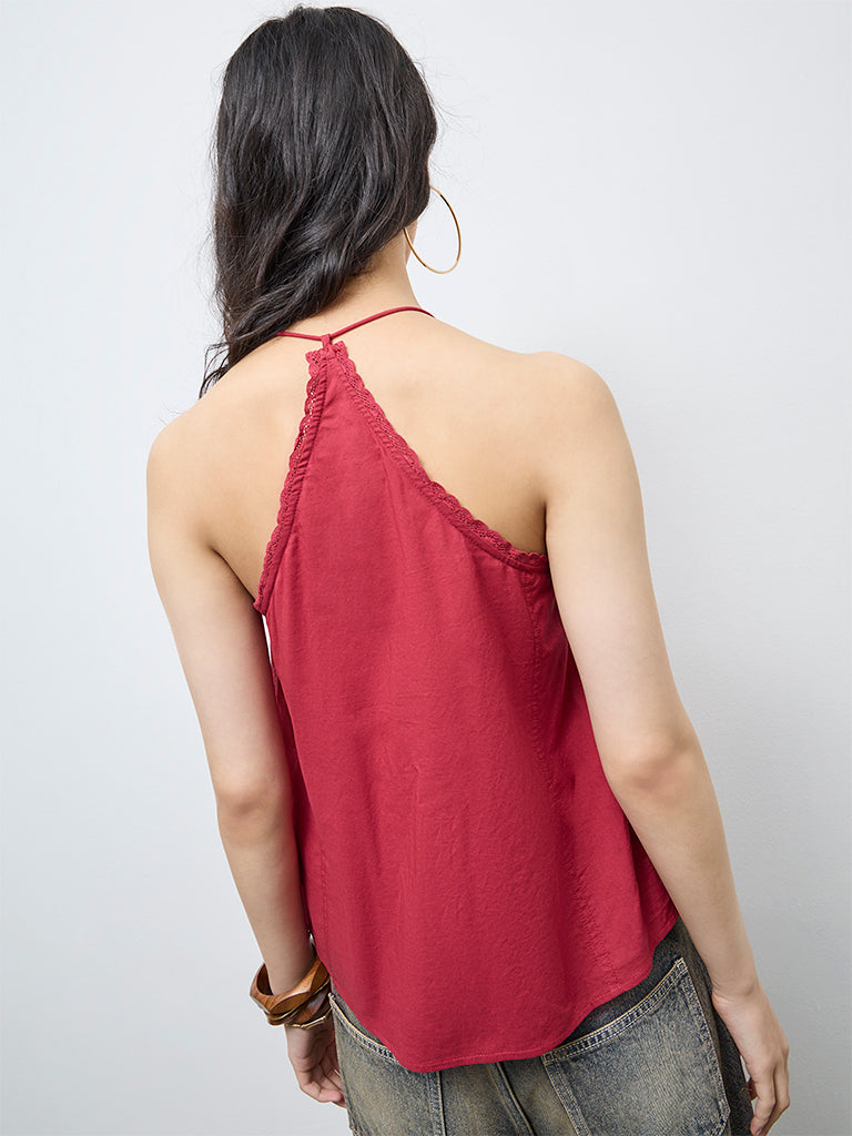 Bombay Paisley presents this red sleeveless top designed with intricate crochet detailing at the bust. An overlapping V shape is framed by a halter neckline, secured with tie string detailing at the back. Subtle pleating under the bust creates a soft flare, lending the piece a light, summer ready silhouette with a chic, feminine finish.