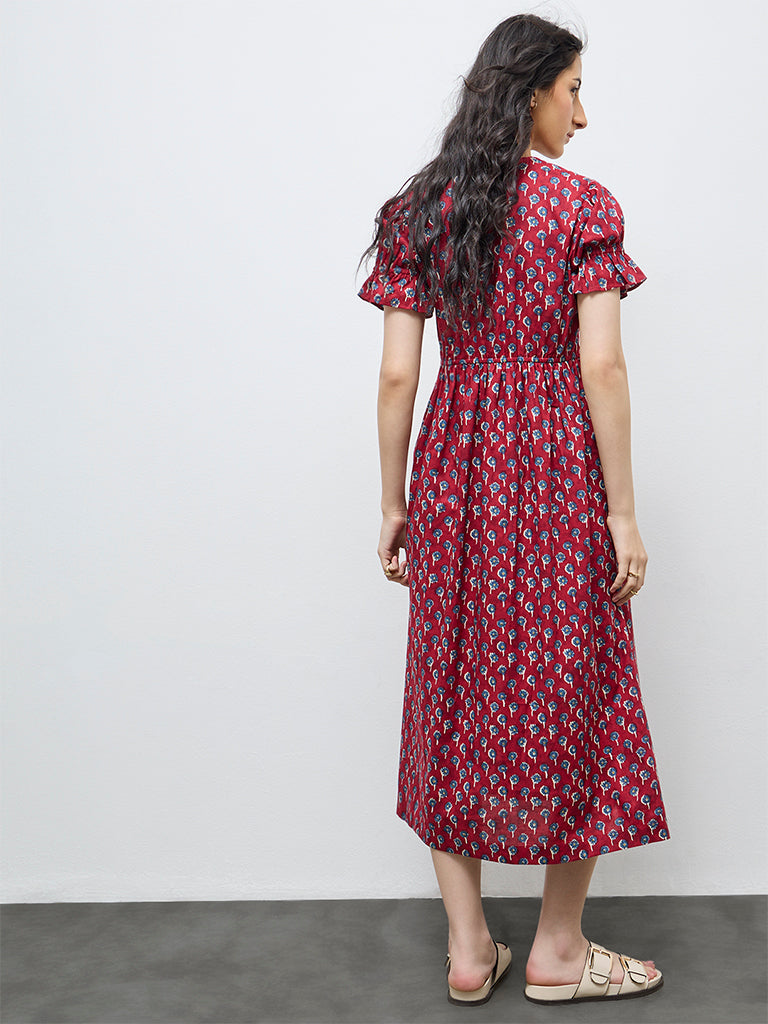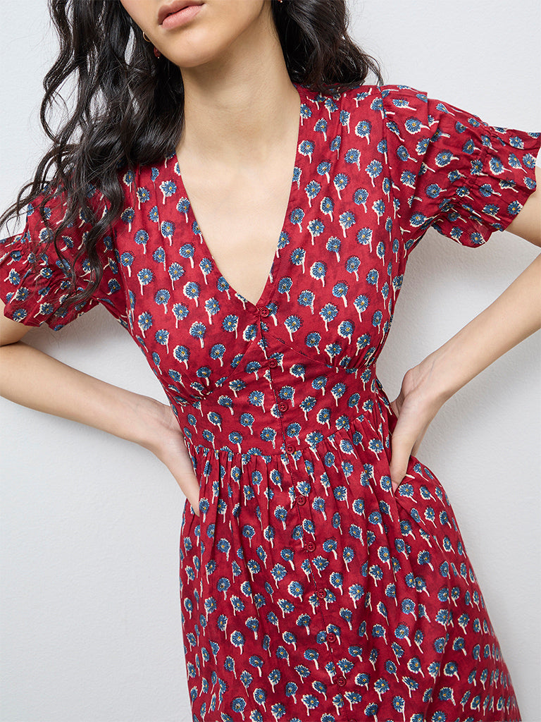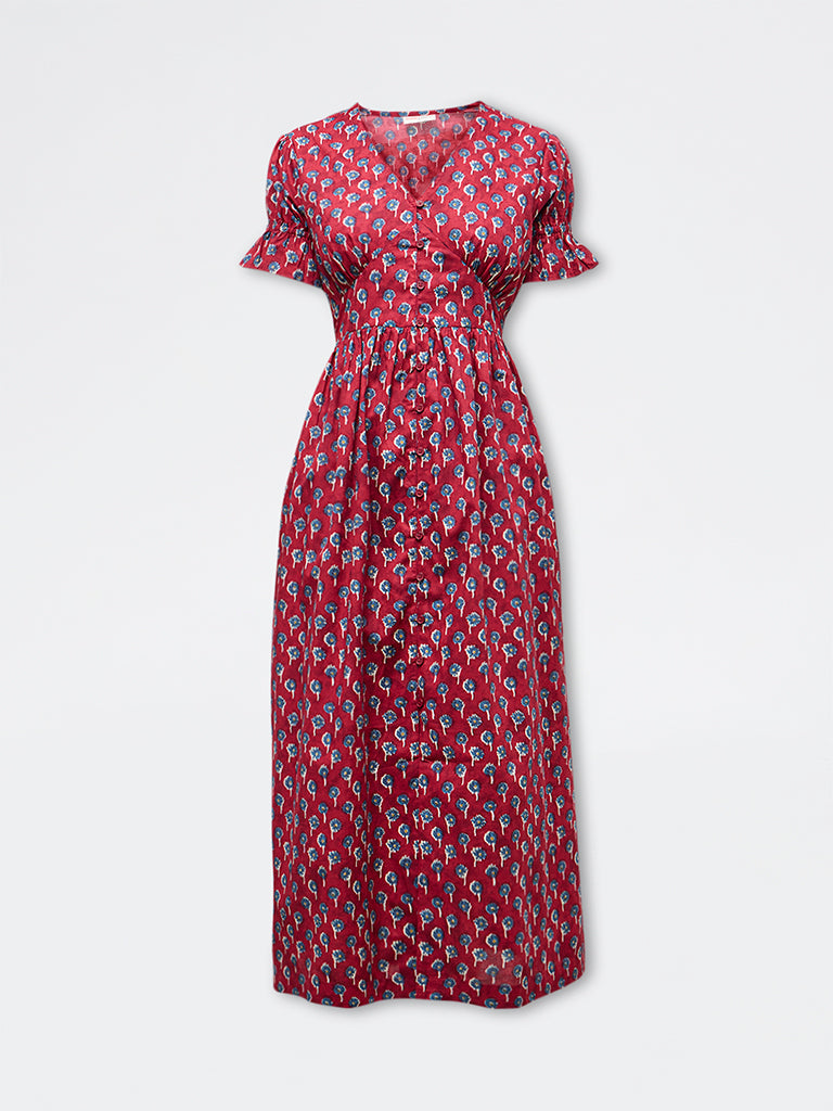 Bombay Paisley presents this red floral printed dress crafted from pure cotton for breathable summer comfort. A deep V-neckline with underbust stitch detailing shapes the fit and flare silhouette. Short sleeves are gently gathered at the cuffs, while imitation buttons add a sleek touch. Finished with side pockets, it blends bohemian charm with chic, everyday appeal.