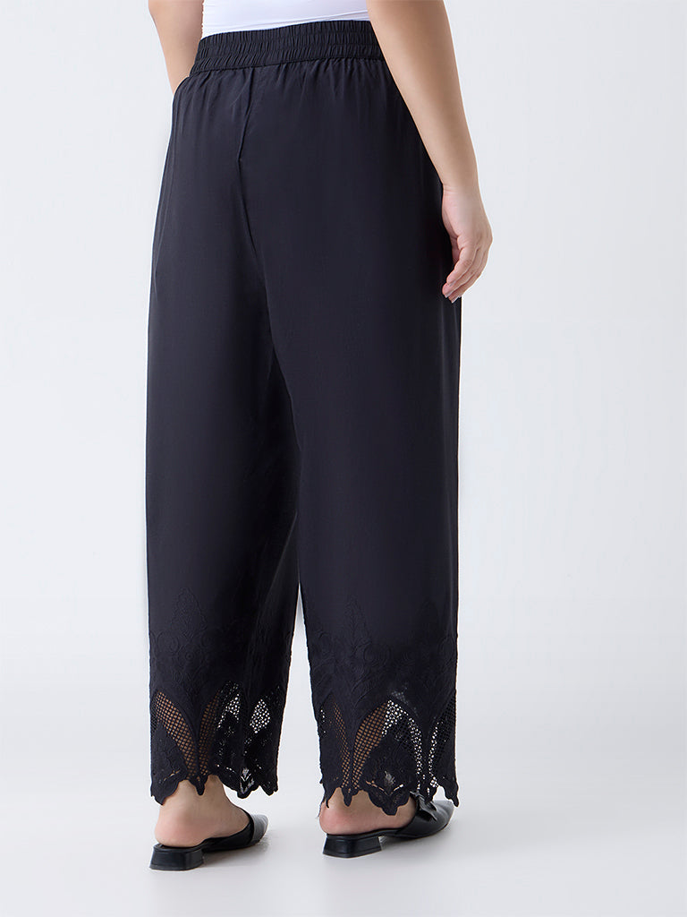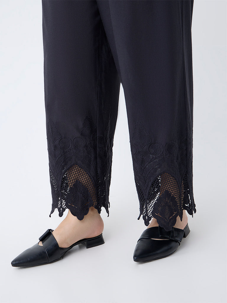 Add a touch of elegance to your ethnic wardrobe with these black cotton pants from Diza. Highlighted with delicate floral embroidery at the bottom, they feature a smooth elastic waistband for a comfortable fit and practical side pockets for everyday ease.