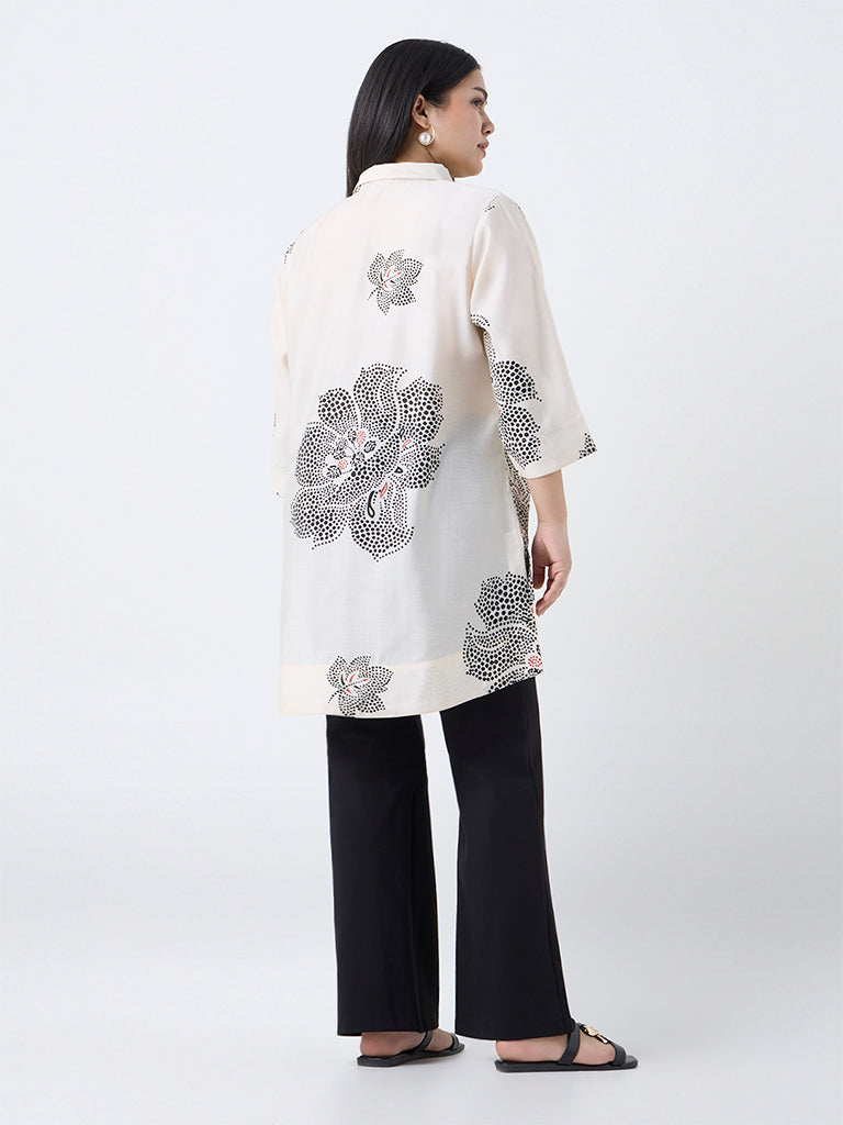 Decked with dainty floral motifs, this cream tunic from Diza brings a soft, contemporary edge to traditional styling. Made from breathable fabric, it features a structured collar, button-up front, three-quarter sleeves, and a high-low hemline for fluid movement.