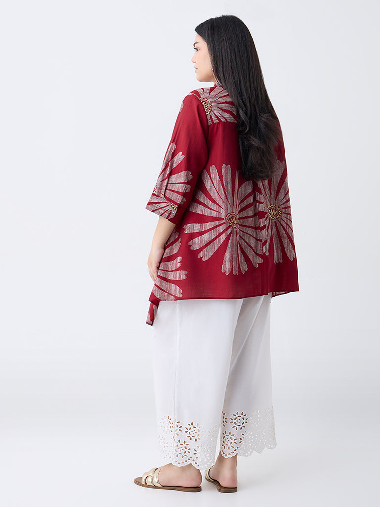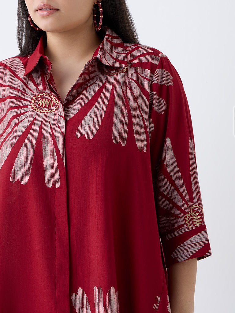 Effortless charm meets modern detailing in this red tunic from Diza. The concealed button placket keeps the look clean, while the three-quarter sleeves and asymmetric hemline create a silhouette that flatters from every angle. The warm golden floral print brings a festive lift, making it a versatile choice for casual days and celebratory evenings alike.