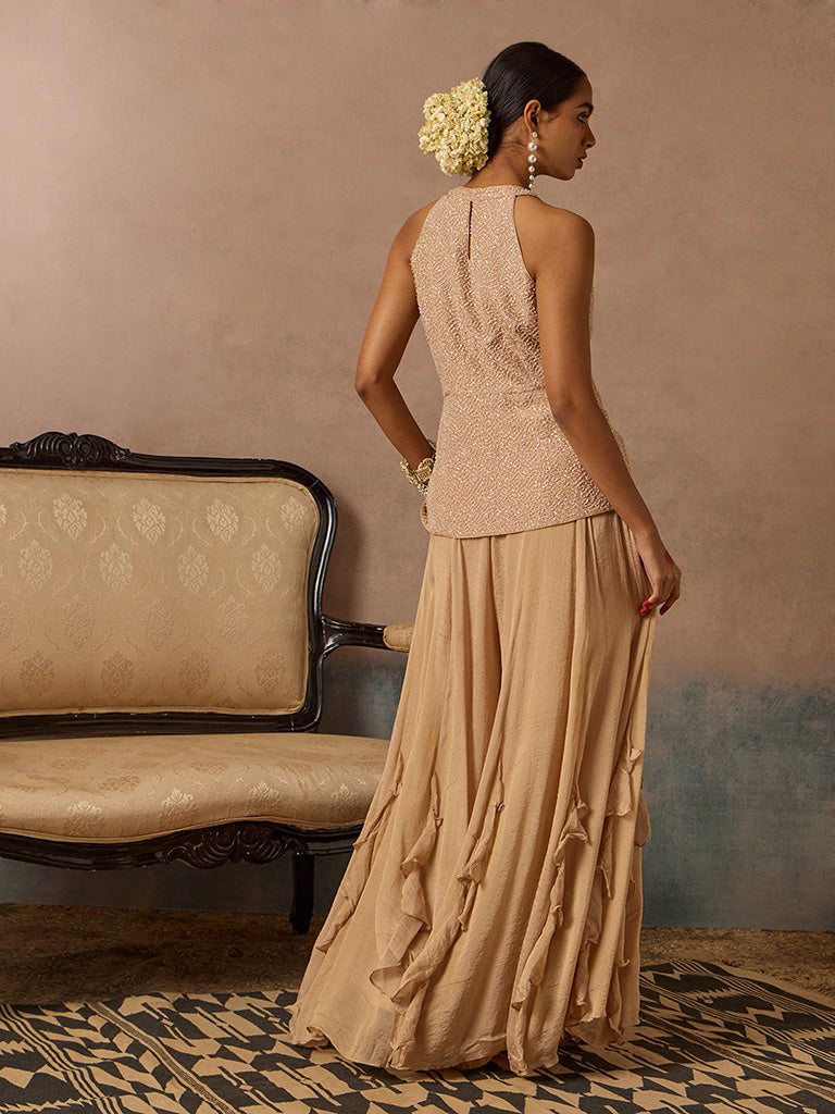For celebrations that run long and call for comfort, this beige set blends ease with subtle shine. The halter-neck top is crafted from a smooth fabric and detailed with beaded embellishments that add a gentle shimmer. The wide-leg pants are made from a fluid fabric and finished with ruffle detailing for soft movement. An elasticated waistband and a secure side zipper make the entire set easy to wear from day to night.