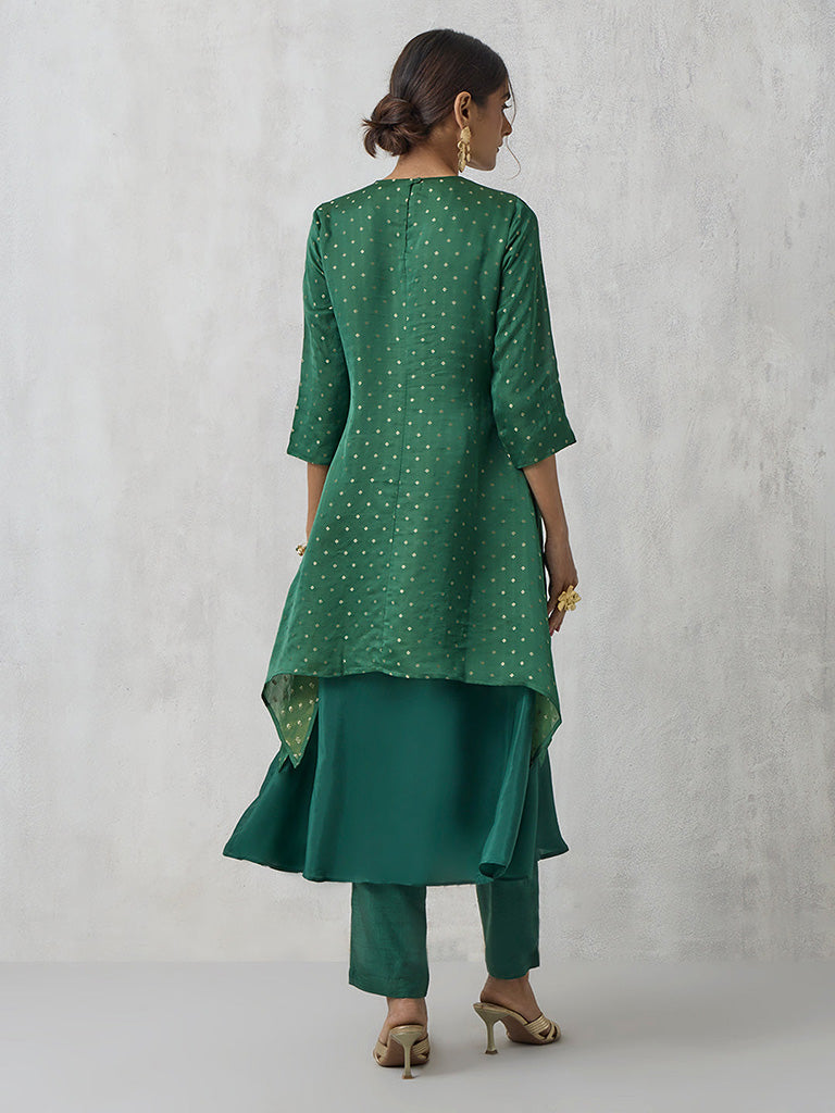 Radiating quiet grandeur, this green kurta is crafted to celebrate the season with sophistication. The kurta features a round neck adorned with intricate embroidery, while woven motifs shimmer subtly across the fabric, lending an opulent touch.
