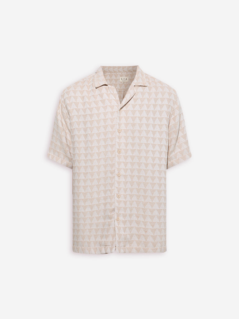 ETA elevates casualwear with this beige shirt adorned with eye-catching geometric prints. Tailored in a relaxed silhouette from a cotton-rich fabric, it’s styled with a classic camp collar, button placket, and half sleeves—striking the perfect balance between comfort and contemporary style.