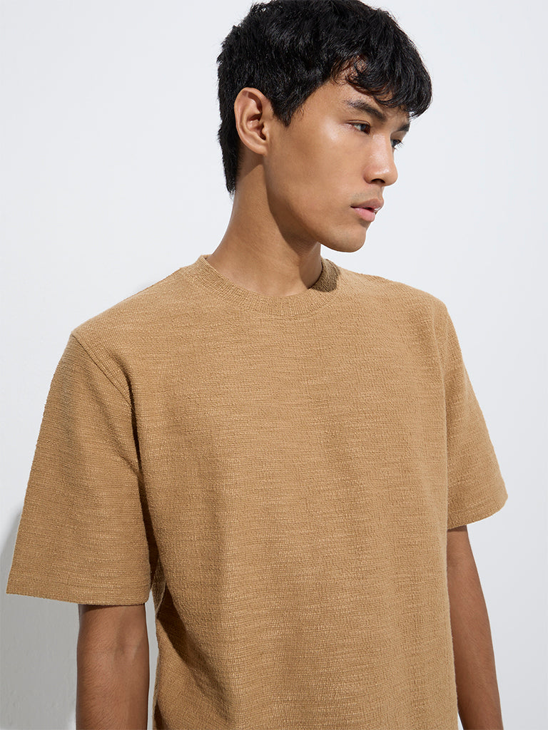 Add a touch of texture to your casual lineup with this mustard t-shirt from ETA. Crafted from a rich cotton-blend, it features a relaxed frame with a round neckline and half sleeves, making it a versatile pick for everyday wear.