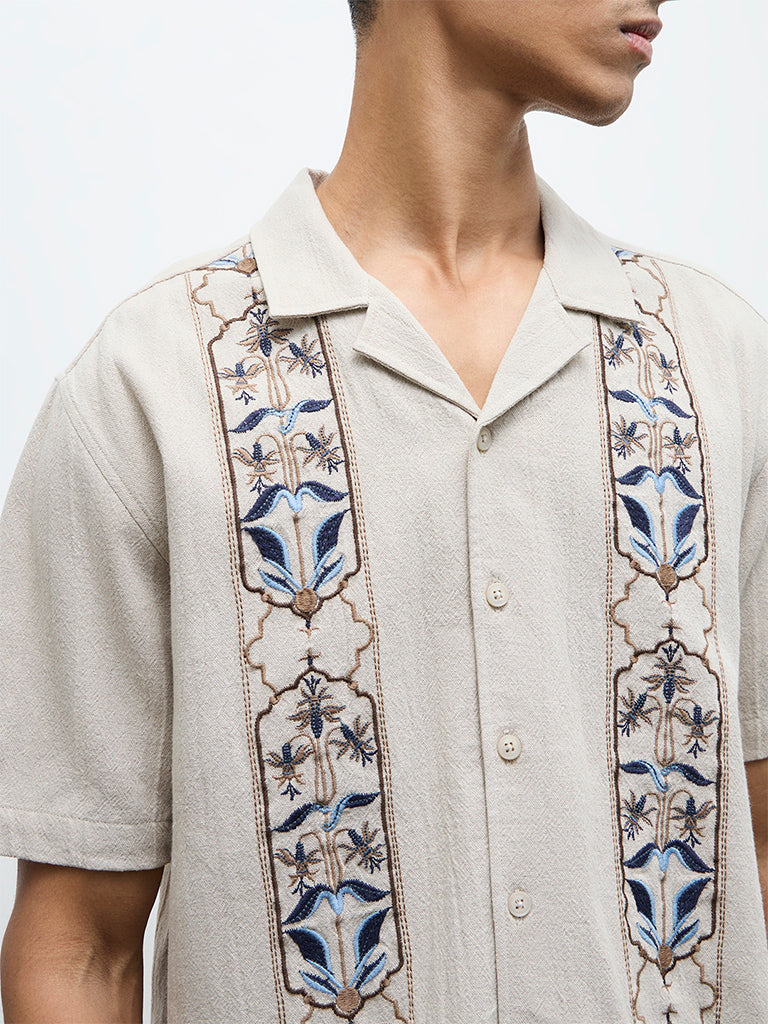 ETA Taupe Floral Embroidered Relaxed-Fit Cotton Shirt