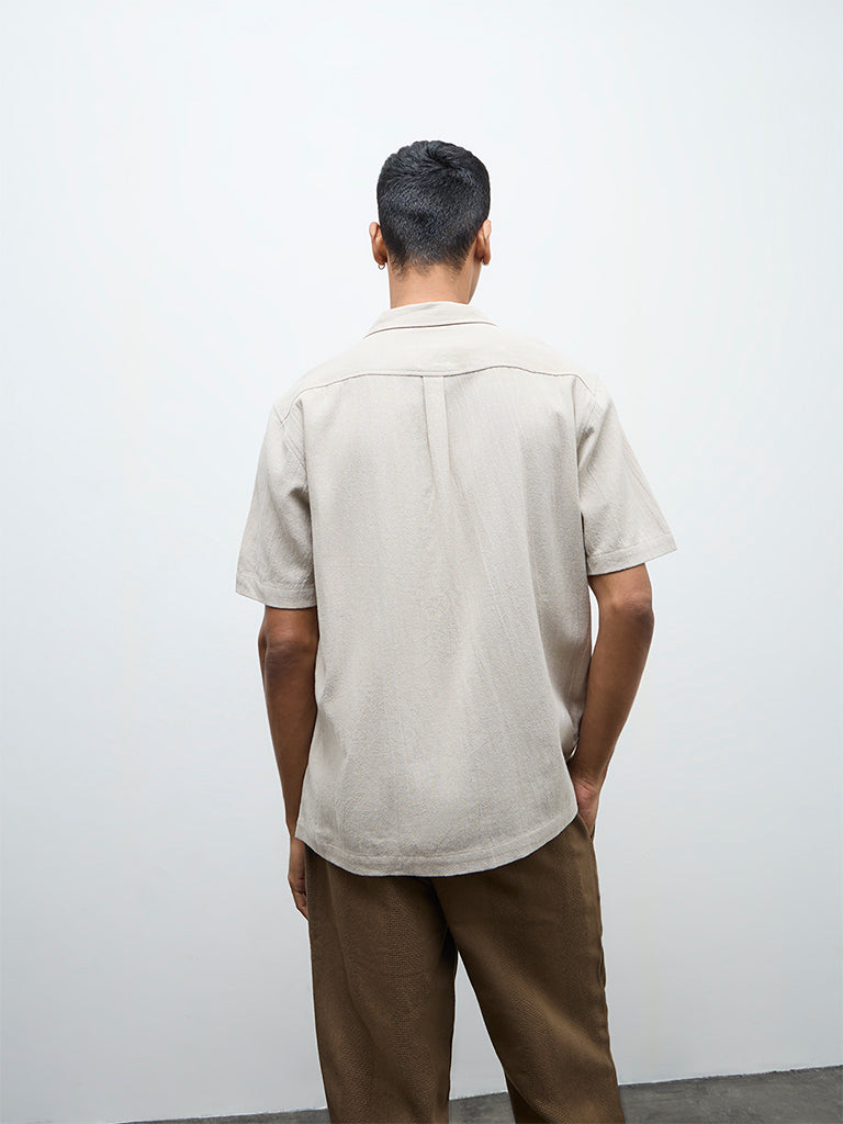 Make an eye-catching impression with this taupe shirt from ETA, featuring floral embroidered panels at the front. Tailored in a relaxed silhouette, it is styled with a notch collar, short sleeves and a button-up front. Crafted from a soft cotton-blend fabric, it promises breathability and comfort from day to night.