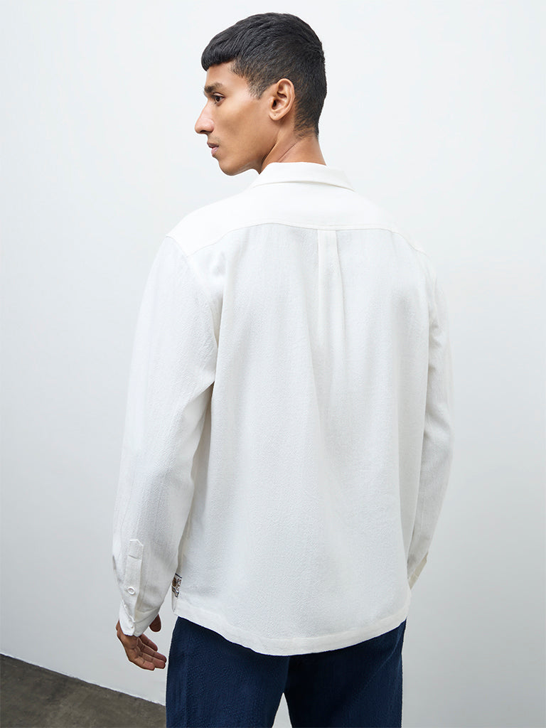 Strike a refined note with this off-white shirt from ETA, detailed with tropical embroidery along the hem. Cut in a relaxed silhouette, it features a notched collar, full sleeves and a classic button-up front. Crafted from a soft, cotton-rich fabric, it offers breathable comfort through the day and into the evening.
