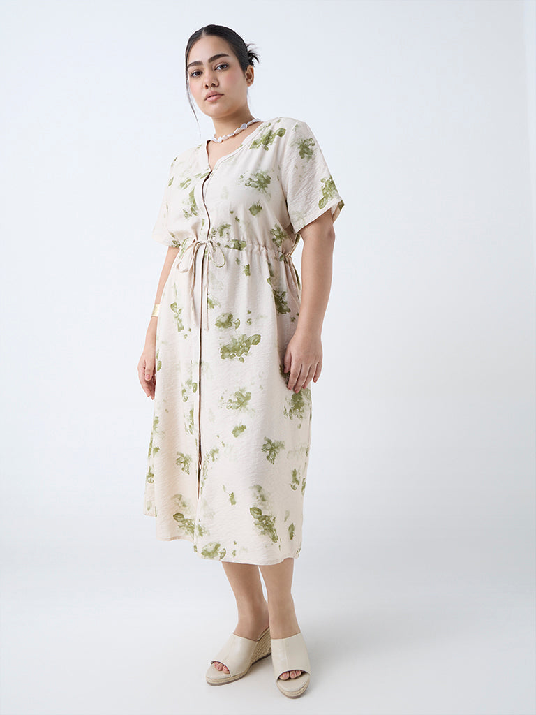 Enliven your daytime assortment with this beige dress from Gia, adorned with floral motifs for feminine charm. The V-neck extends into a concealed button placket, while adjustable drawstrings at the waist create a flattering shape. Finished with side pockets, it blends charm and practicality in equal measure.