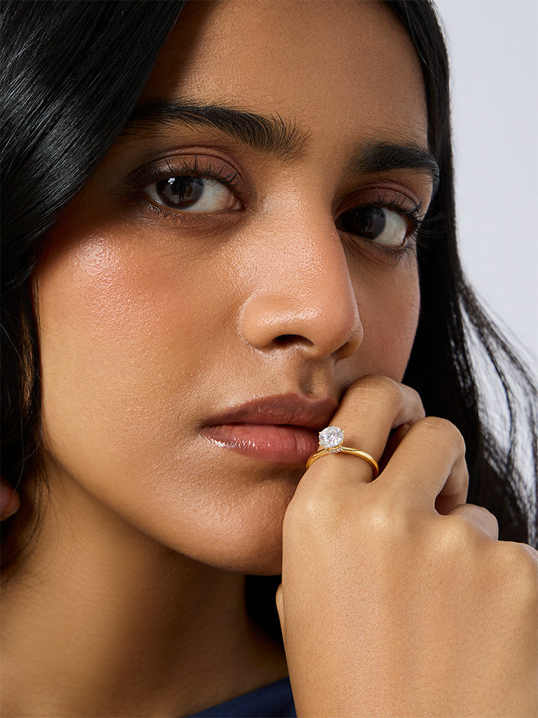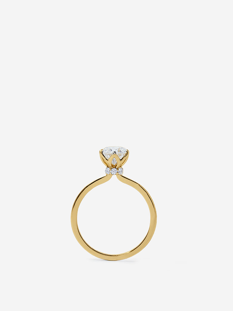 A study in timeless elegance, this Westside X Pome solitaire ring highlights the pure brilliance of a single round-cut white diamond. Set on a slender, polished yellow gold band, the stone’s radiant facets catch the light from every angle, creating a captivating display of clarity and fire. Designed for modern minimalists and eternal romantics alike, it’s a classic piece that embodies grace and permanence.