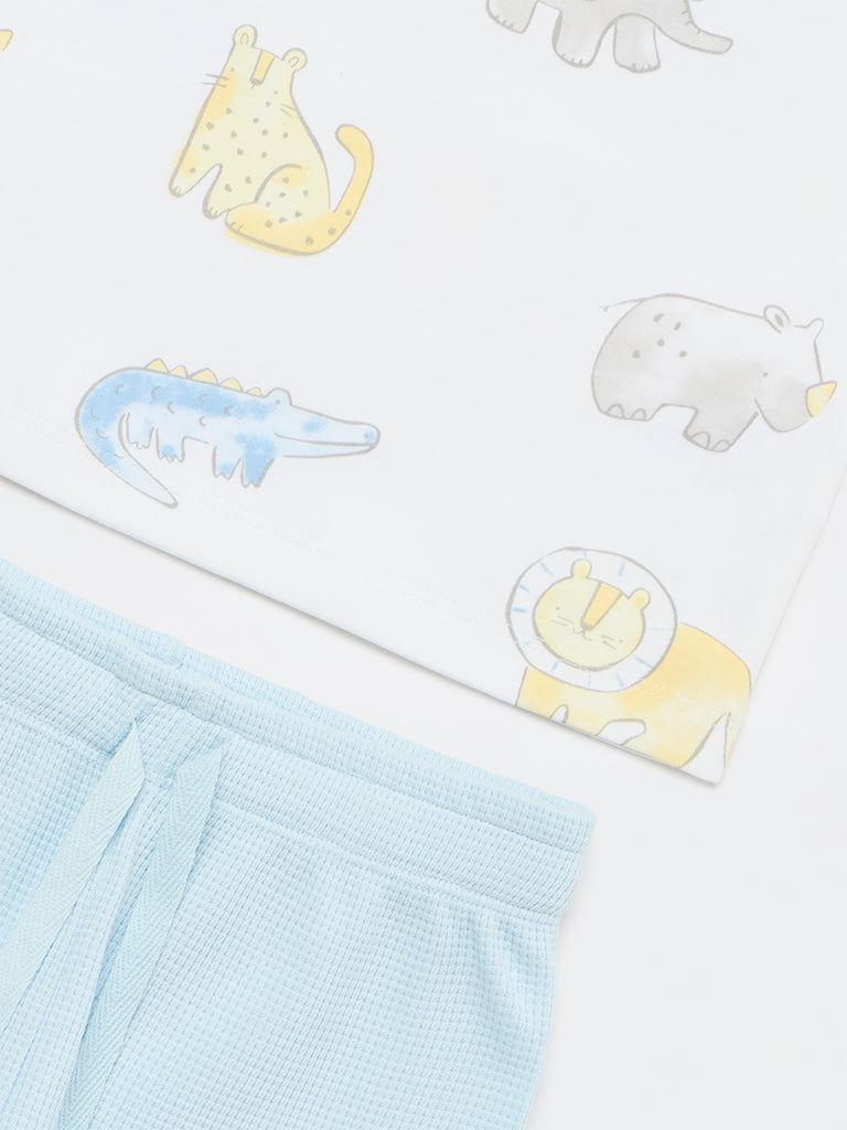 HOP Baby Boys White Animal Printed Cotton T-Shirt and Shorts Set