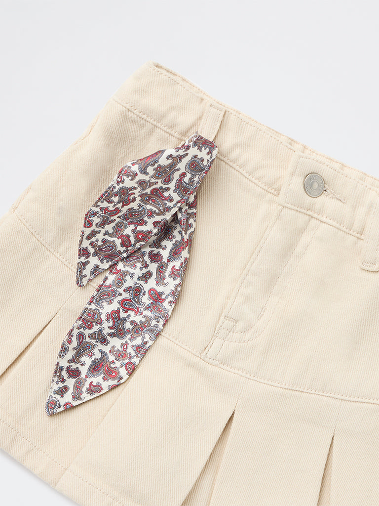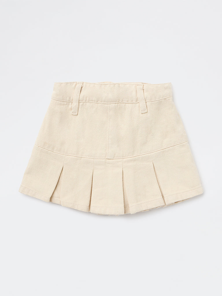 This beige denim Skirt from HOP Kids is designed for a polished look. Featuring a zipper fly, button fastening and an added waist hook for a secure fit, it ensures both comfort and structure. Finished with a pleated hemline, it blends the practicality of shorts with skirt-like elegance.