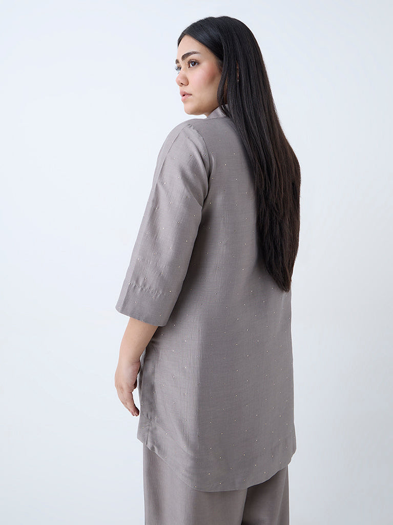 Diza brings a refined touch to your daily looks with this silver ethnic tunic. Accented with shimmering badla prints across a lightweight fabric, it is styled with a crisp collar, a button-up front and three-quarter sleeves for an effortlessly put-together look.