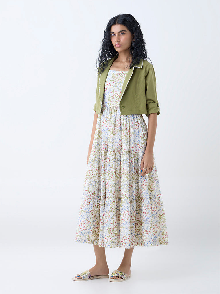 Shaped in a breezy tiered silhouette, this off-white dress from Bombay Paisley is adorned with dainty floral prints for feminine charm. Spun from pure cotton, it features a square neck, adjustable straps, and a smocked back for a flattering fit. Paired with a sage jacket, this ensemble will effortlessly elevate your ensemble.