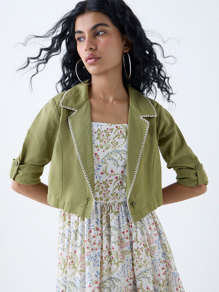 Boost your holiday edit with this olive dress by Bombay Paisley. Adorned with eye-catching floral motifs, it is shaped in an A-line silhouette and made from a premium cotton-blend fabric. The square neck, puff sleeves, and smocked back ensure an effortless fit, while convenient side pockets add a practical finish.