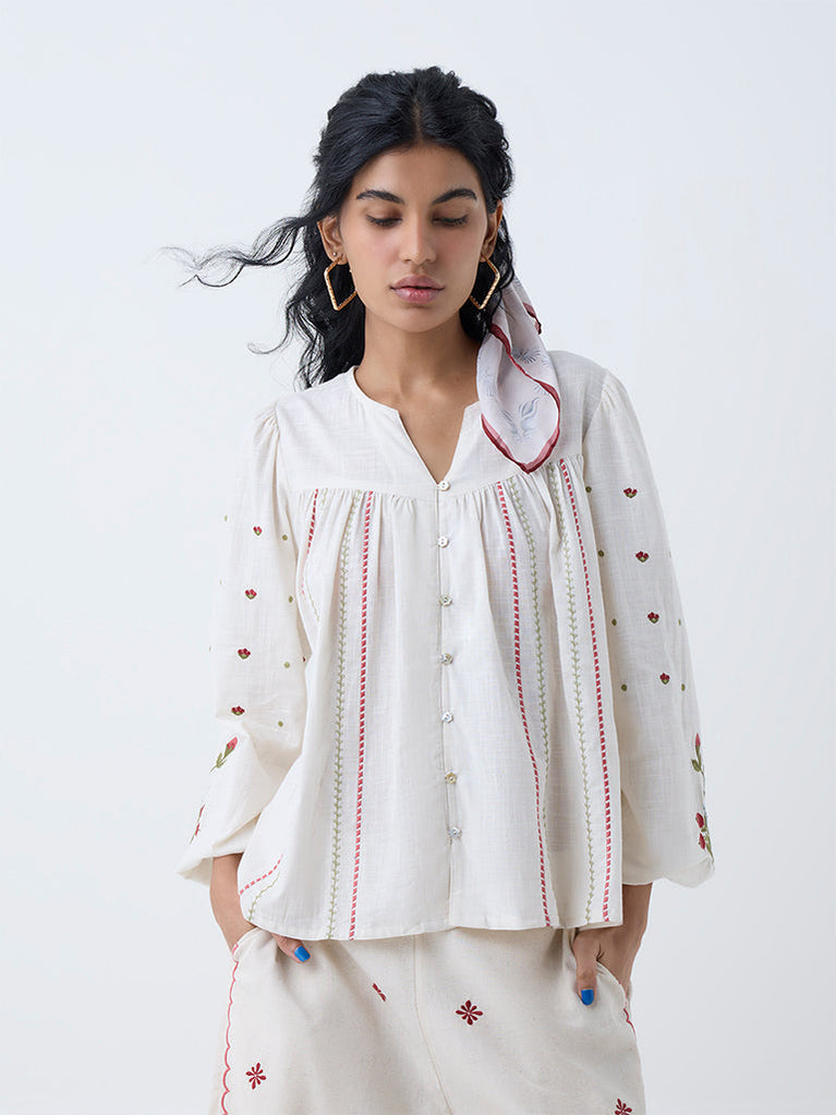Rev up your summer wardrobe with this off-white top from Bombay Paisley. Designed with a split neck, button placket, and peasant sleeves, it highlights exquisite floral motifs for a feminine touch. Made from pure cotton with embroidered stripes on the front, it’s perfect for effortless daytime wear.