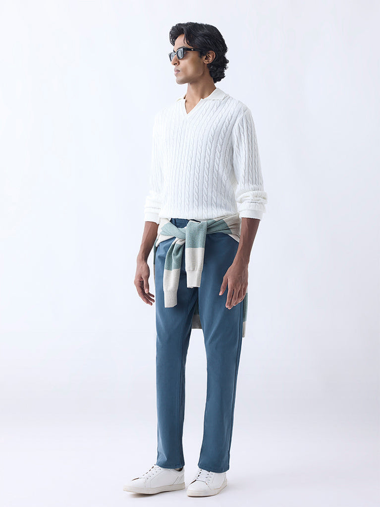 Ascot introduces this white sweater built in a relaxed frame from luxurious-blend fabric. Showcasing a cable-knit texture, it is framed with a polo neck and full sleeves, making it an easy essential for refined casual wear.
