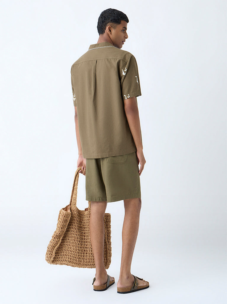 ETA Olive Solid Relaxed-Fit Mid-Rise Cotton-Blend Shorts
