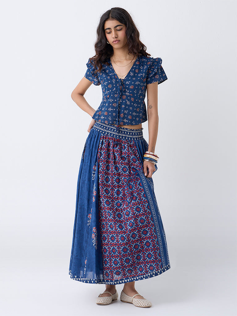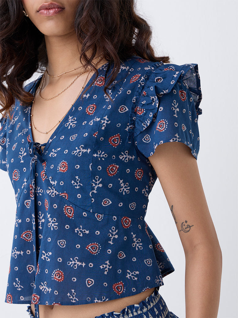 When your outfit needs a little colour without the effort, this blue top from Bombay Paisley delivers. Showcasing vibrant ethnic prints arranged in a balanced composition, it is styled with a V-neck, a front tie detail and short sleeves finished with ruffled accents for gentle volume.