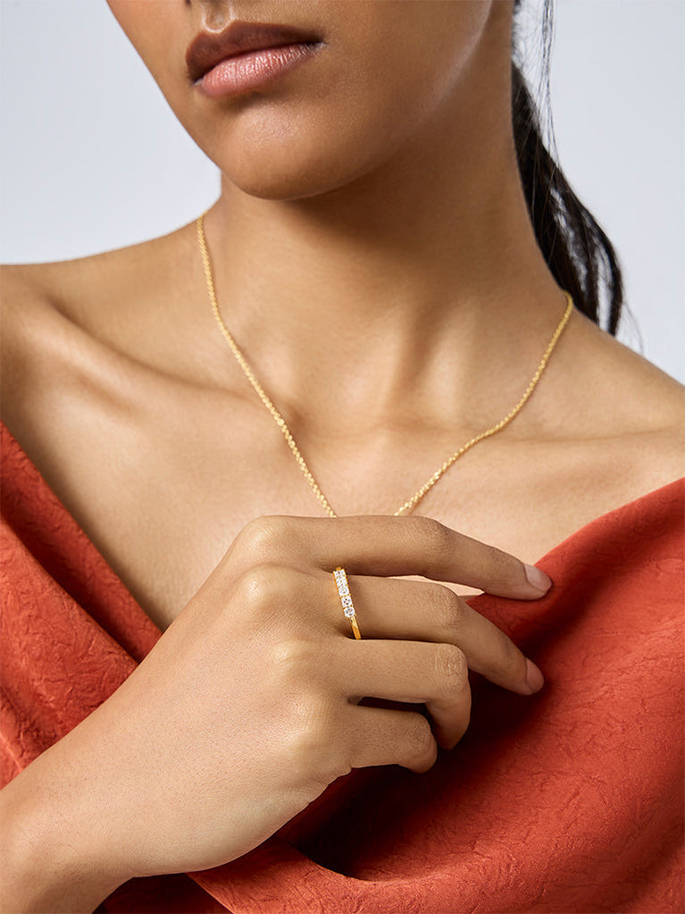 Celebrate a milestone with the enduring beauty of this Westside X Pome horizontal five-stone lab-grown diamond ring. Set on a polished gold band, the design showcases a radiant row of emerald-cut lab diamonds centered around a luminous solitaire, each secured with refined prongs to enhance their linear brilliance. Elegant and timeless, it makes a striking statement worn alone or paired seamlessly with an engagement ring.
