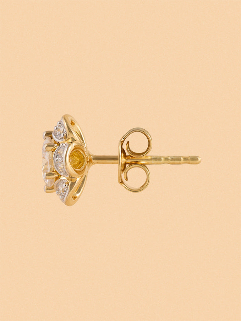 These floral earrings from Westside X Pome bring a touch of timeless elegance to any ensemble. Crafted with a gold-tone finish, they feature a central clear stone encircled by smaller stones, forming a delicate clustered design. Secured with a post-back closure for a comfortable fit, these earrings effortlessly add a hint of sparkle to both everyday looks and special occasions.