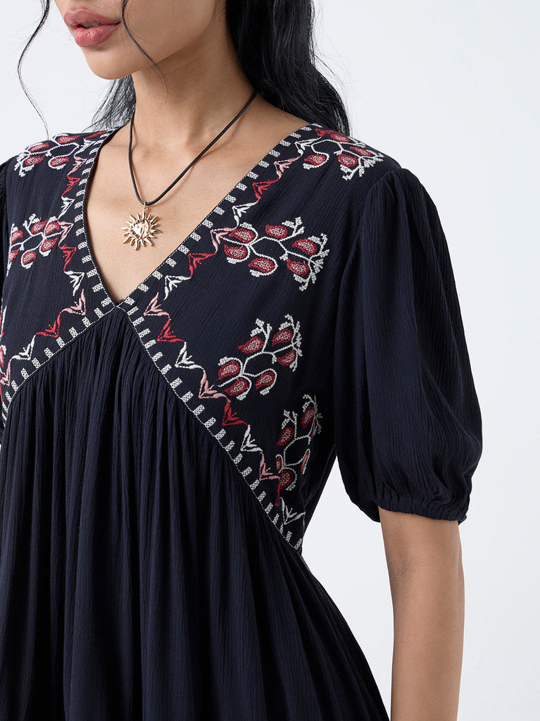 A blend of texture and tradition, this black dress from Bombay Paisley features intricate embroidery gracing the yoke, adding an artisanal dimension to its elegant shape. Crafted from a crinkle-textured fabric, the empire-line silhouette drapes with soft movement, framed by a V-neck and airy puff sleeves.