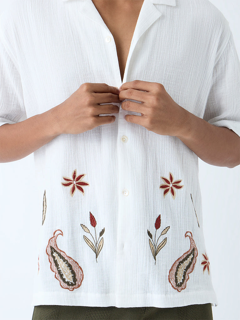 ETA White Floral Embroidered Relaxed-Fit Cotton Shirt