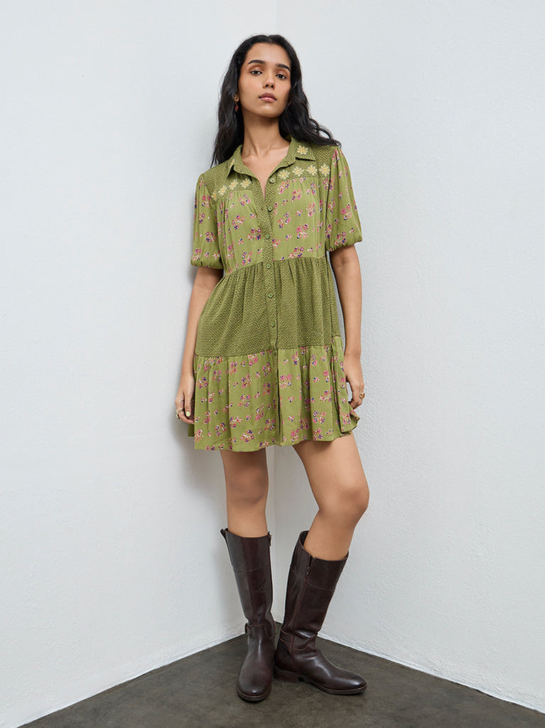 Bombay Paisley Sage Floral Embroidered Cotton A-Line Dress