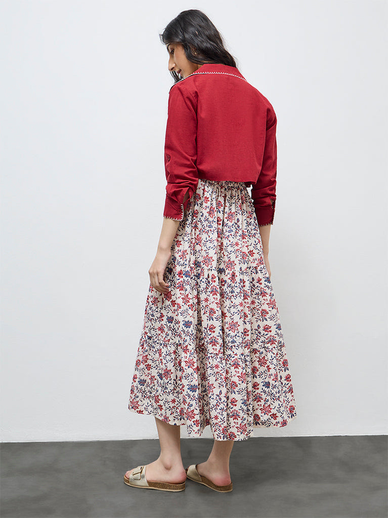 Bombay Paisley presents this off-white floral printed cotton summer dress designed with a square neckline and slender shoulder straps. A smocked back shapes the fit-and-flare silhouette, while tiered construction adds volume and fluid drape. Styled with a contrasting solid red jacket featuring a notched lapel collar and full sleeves, the look blends bohemian charm with contemporary, timeless appeal.