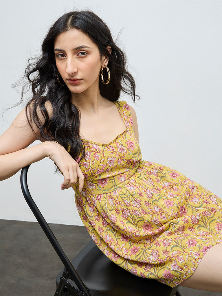 Brighten everyday looks with this yellow dress from Bombay Paisley, adorned with soft floral motifs. Spun from a cotton-rich fabric, the A-line silhouette is complemented by a square neckline and broad shoulder straps, creating a breezy yet flattering profile.