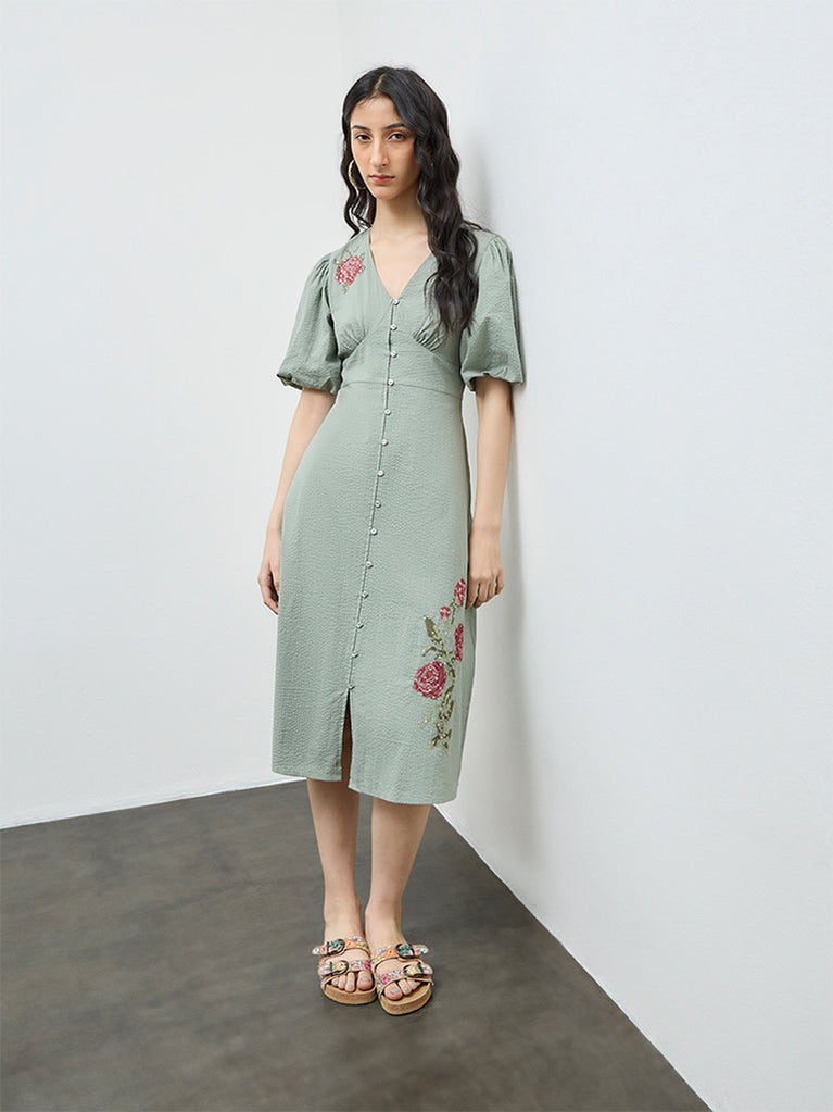 Highlight understated elegance in this sage Bombay Paisley dress, adorned with floral embroidery across the front. Crafted from pure cotton, it is shaped in a flowing A-line silhouette with a V-neck and softly puffed sleeves, lending a handcrafted, vintage-inspired feel to everyday dressing.