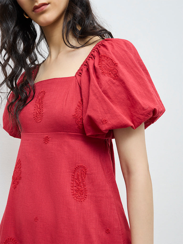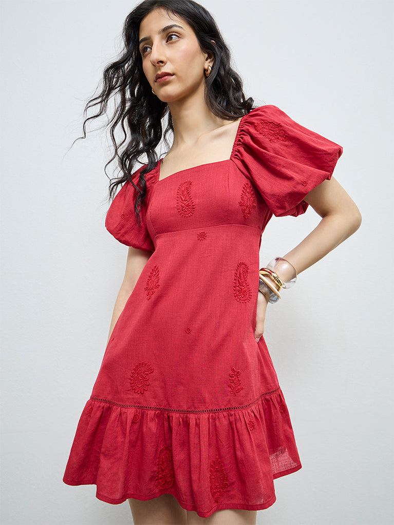 Make a confident style statement in this red A-line dress by Bombay Paisley, designed with a flattering square neckline and voluminous puff sleeves. Delicate paisley embroidery flows across the silhouette, while tie-up detailing at the back adds a feminine finish—perfect for standout summer moments.