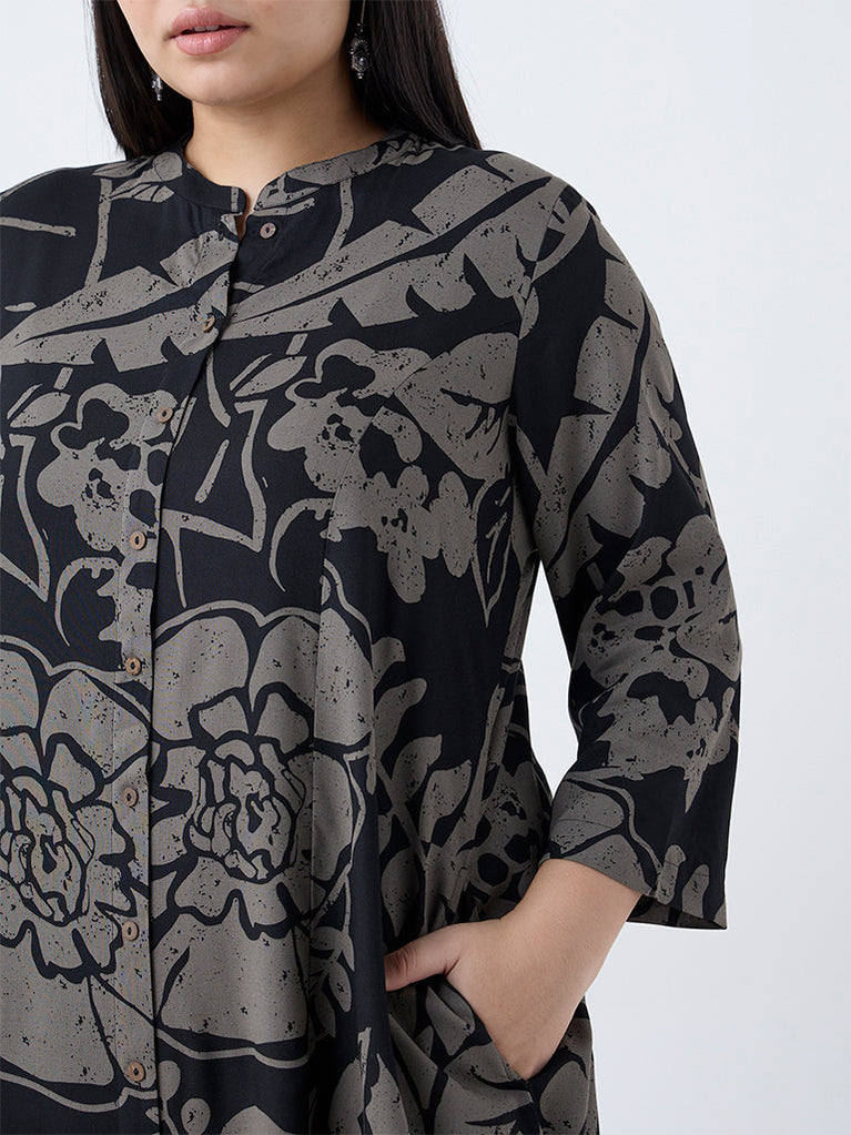 Diza presents this black A-line kurta adorned with a floral print for a timeless appeal. It features a band neck, button-down front, and three-quarter sleeves, along with practical side pockets. Crafted from a quality fabric, it ensures comfort with every wear.