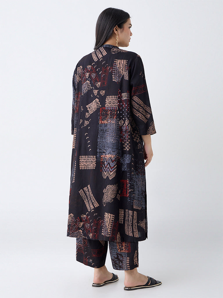 Diza Black Floral Embroidered Cotton A-Line Kurta