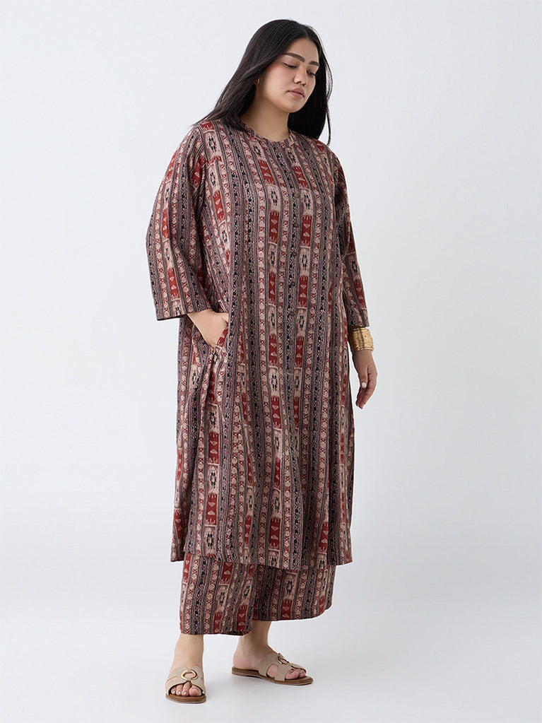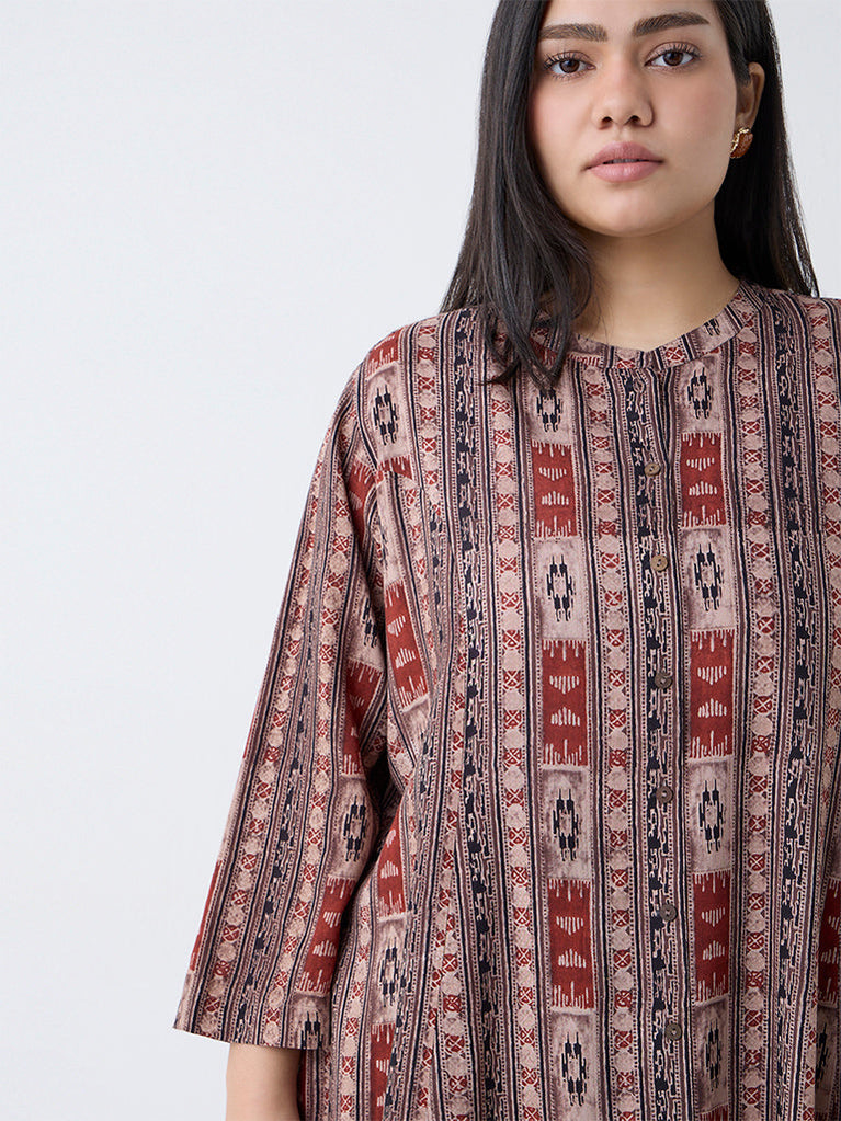 This beige kurta from Diza brings together everyday comfort and festive refinement. Tailored from lightweight fabric in an A-line frame, it creates a flattering, flowy shape. The contrast prints and front button detailing add definition, while the band collar and 3/4th sleeves lend structure. Finished with a slip pocket for convenience, it’s ideal for understated festive dressing.