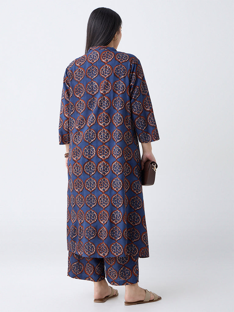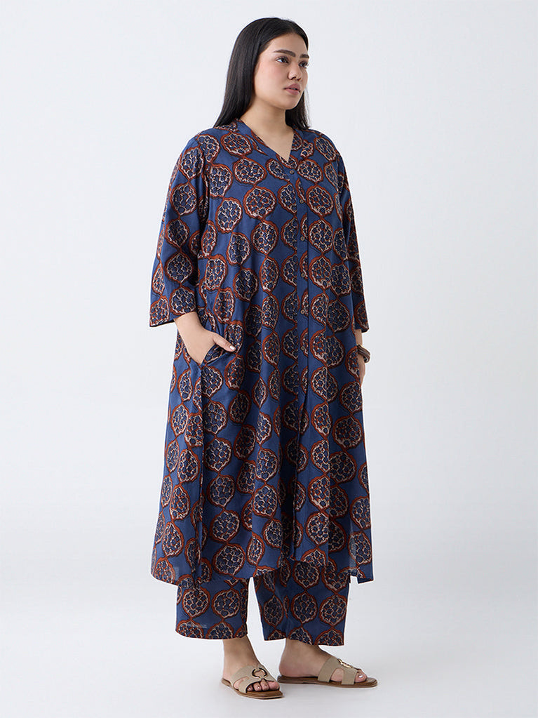 Diza presents this indigo A-line kurta adorned with a floral print for a timeless appeal. It features a round neck, button-down front, and three-quarter sleeves, along with practical side pockets. Crafted from a quality fabric, it ensures comfort with every wear.