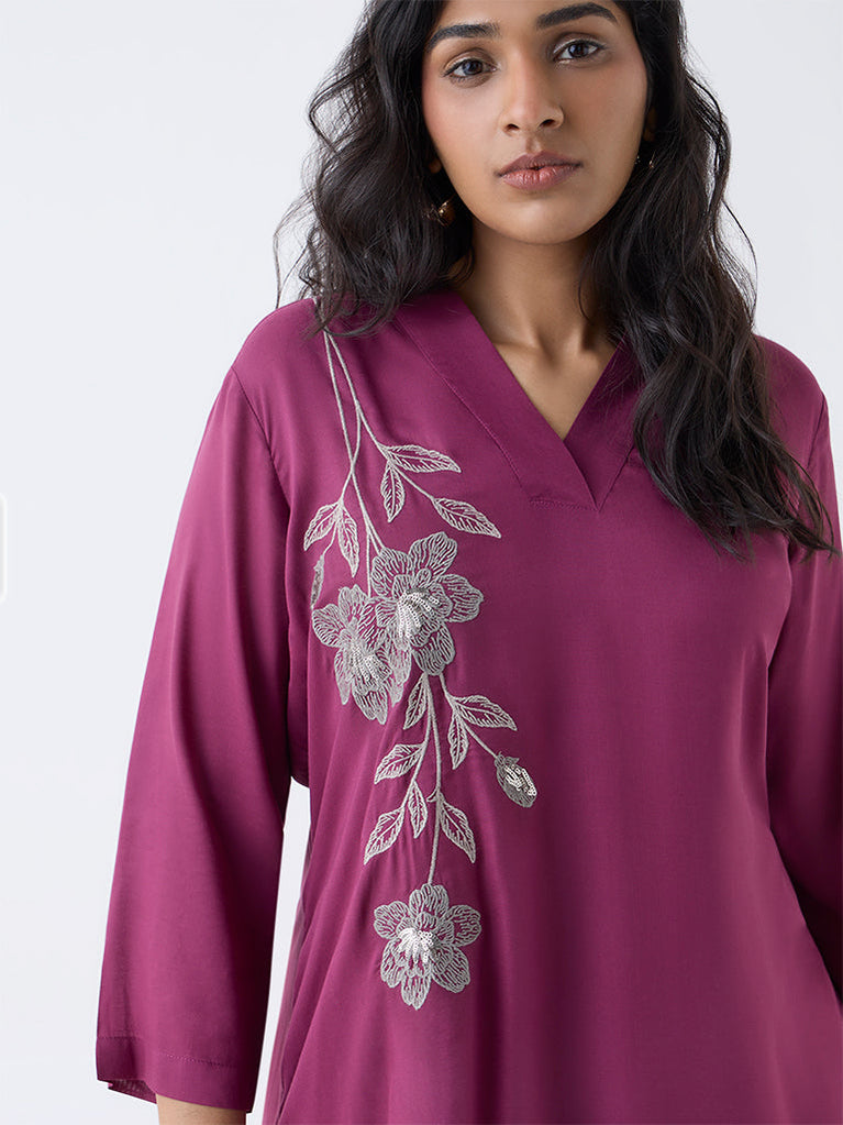 Breathe new life into festive dressing with this plum kurta from Diza. Embroidered with delicate floral motifs, it’s tailored from a lightweight fabric that moves with ease. The V-neckline, side pockets and three-quarter sleeves add practical charm to its graceful aesthetic.
