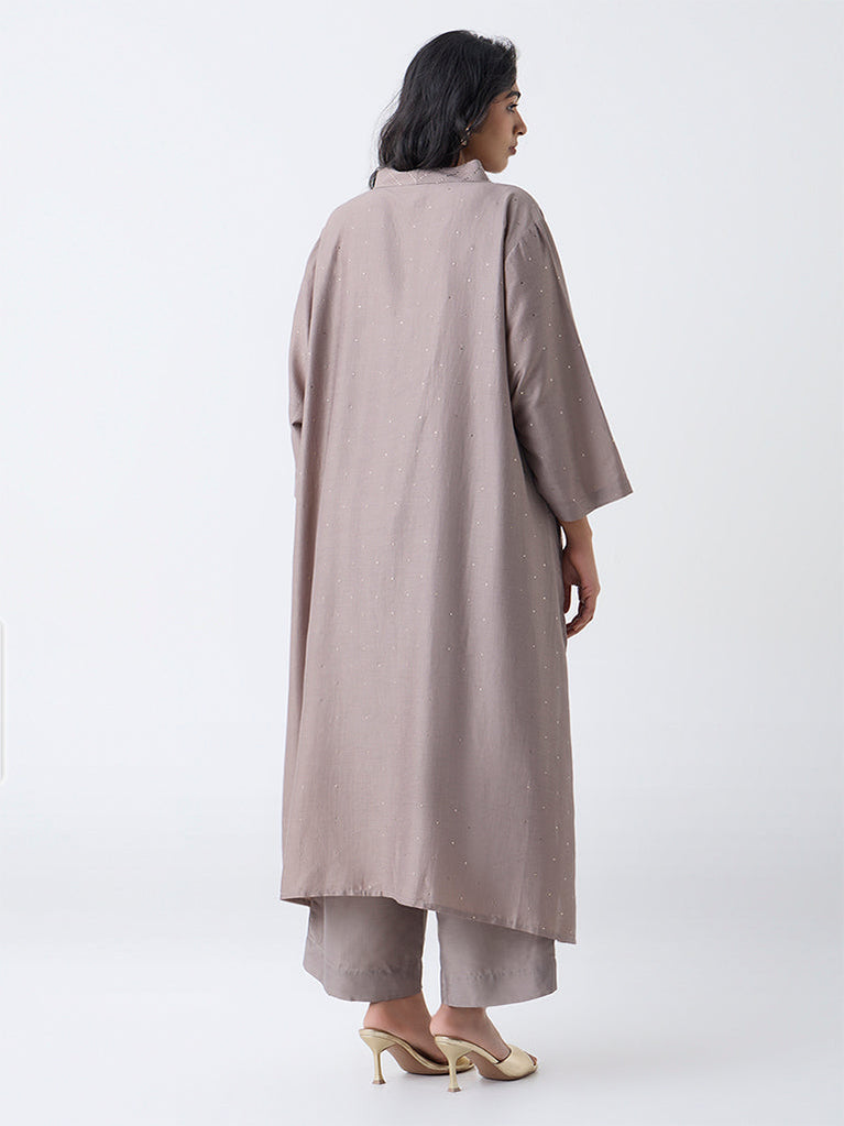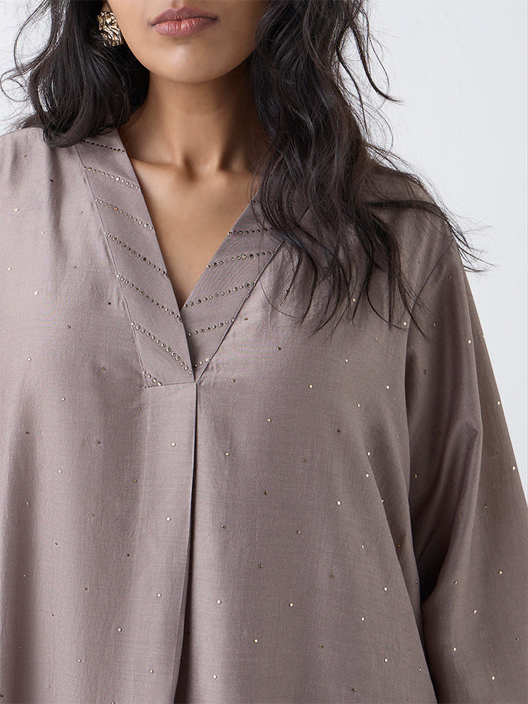 Bring a touch of festive luxury to your wardrobe with this taupe kurta from Diza. Detailed with gold-toned embellishments for a hint of radiance, it’s shaped in a flattering A-line silhouette with a V-neckline, three-quarter sleeves, and side pockets for everyday practicality.