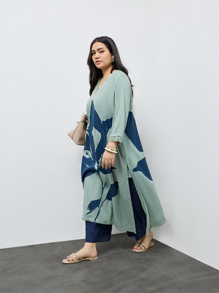 This mint kurta from Diza features a large floral motif that brings a fresh, traditional touch to the design. Cut in an A-line silhouette, it is crafted from a breathable fabric that allows ease of movement through the day. A V-neck and full sleeves decorated with a lace trim defines the shape, while side pockets add a practical element.