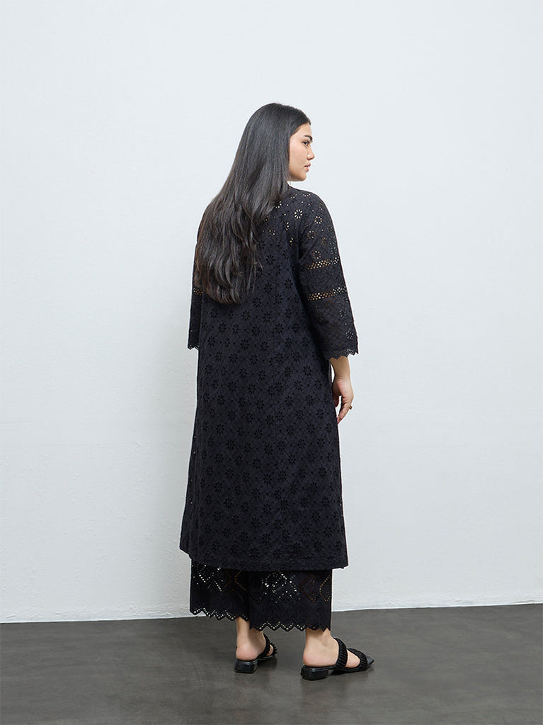 Diza Black Schiffli Embroidered A-Line Cotton Kurta