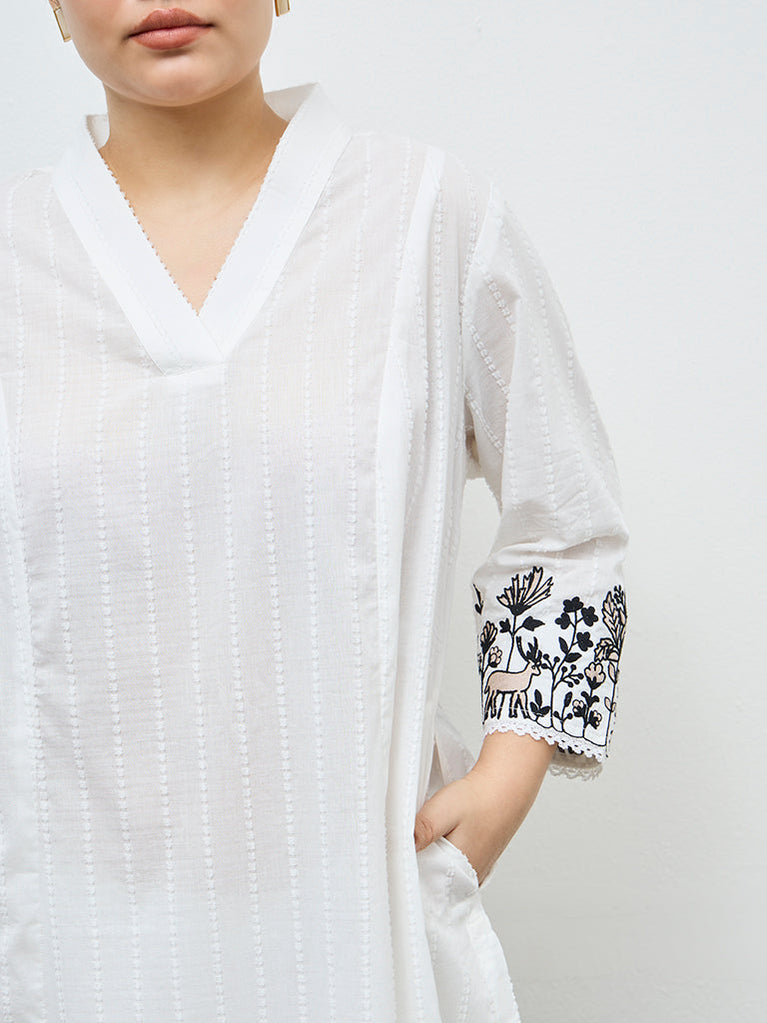 This white kurta from Diza features textured details on an A-line silhouette, elevating the traditional appeal. It is crafted from a pure cotton fabric that allows ease of movement through the day. A V-neck and three-quarter sleeves decorated with floral embroidery defines the shape, while side pockets add a practical element.