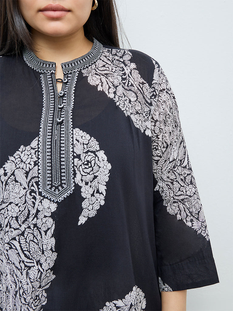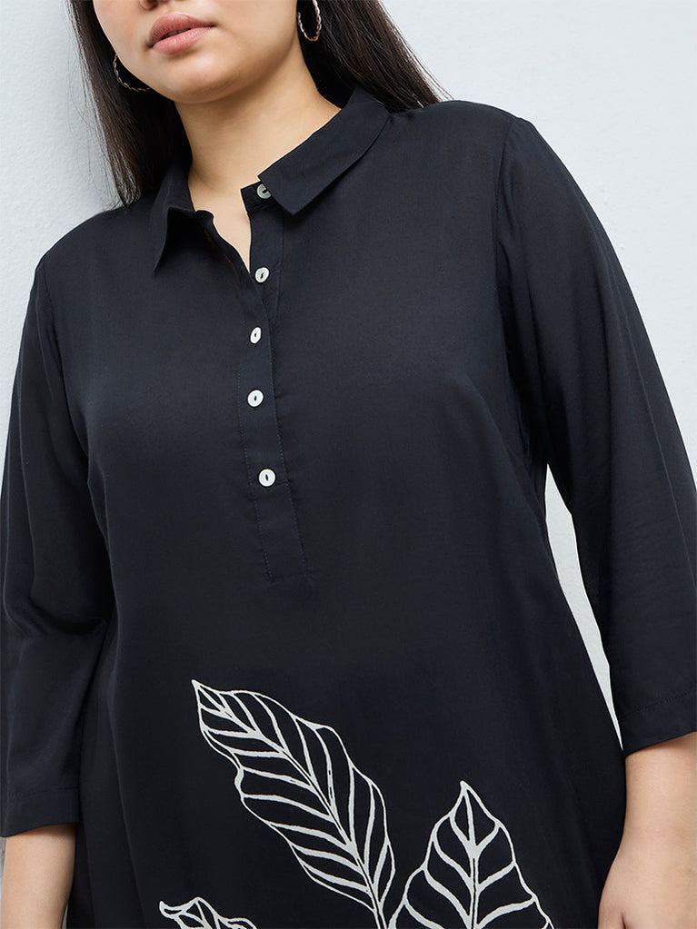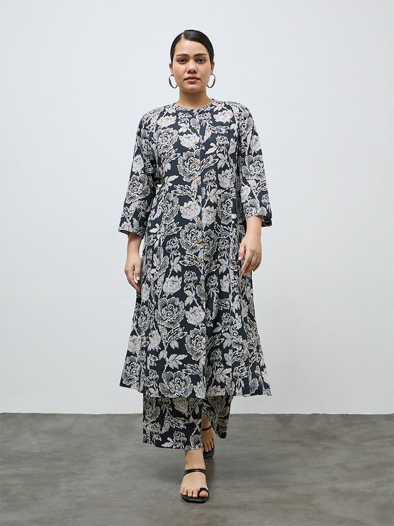 Diza Black Botanical Design A-Line Kurta