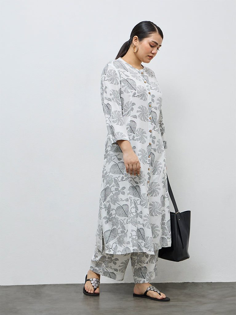 Diza White Leaf Design A-Line Kurta