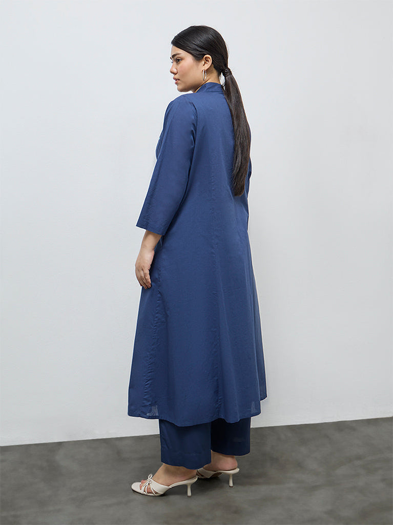 Diza Indigo Floral Embroidered Cotton A-Line Kurta