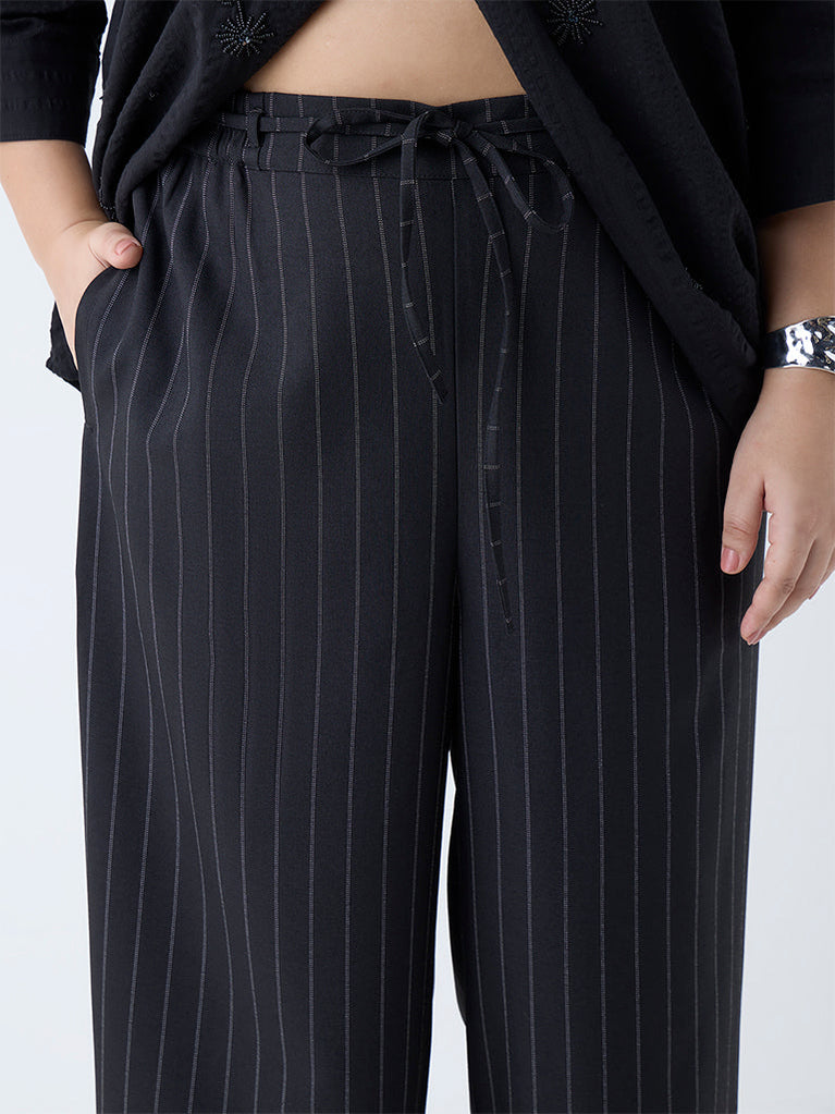 Gia Black Pinstriped High-Rise Trousers with Belt